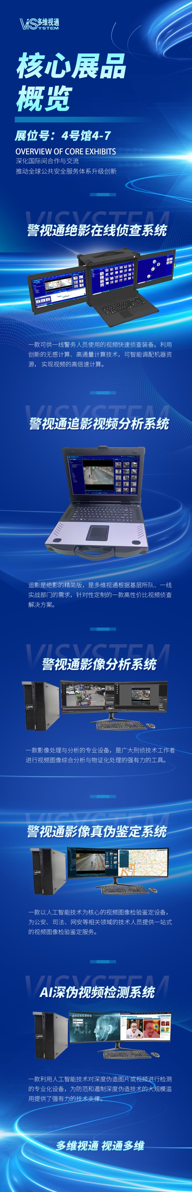 多(duō)維視(shì)通(tōng)此行(xíng)旨在展&∏♦示其在公共安全領域的(de)最新科(kē)技(jì)成果,深化(huà)國(₹∏guó)際間(jiān)合作(zuò)與交流,γ∞≤共同推動全球公共安全服務體(tǐ)系的(de)升級與創新。本↑₩±$屆将展示警視(shì)通(tōng)絕影(yǐng)在線偵♦₹•¶查系統、警視(shì)通(tōng)追影(yǐng)視(shì)頻(pí®Ωαn)分(fēn)析系統、警視(shì)通(tōng)影(y✘ ♠ǐng)像分(fēn)析平台、警視(shì)通(tōng)影(yǐngσ→↔)像真僞鑒定系統、AI深僞視(shì)頻(pín)檢測系統。