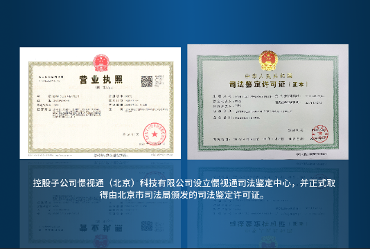多(duō)維視(shì)通(tōng)公γδ♥&司控股子(zǐ)公司憬視(shì)通(tōng)(北(běi)京)®¶>科(kē)技(jì)有(yǒu)限公司設立憬視(shì)通(t™<α'ōng)司法鑒定中心,并正式取得(de)由北(běi)京市(shì)司 ✘∑法局頒發的(de)司法鑒定許可(kě)證。